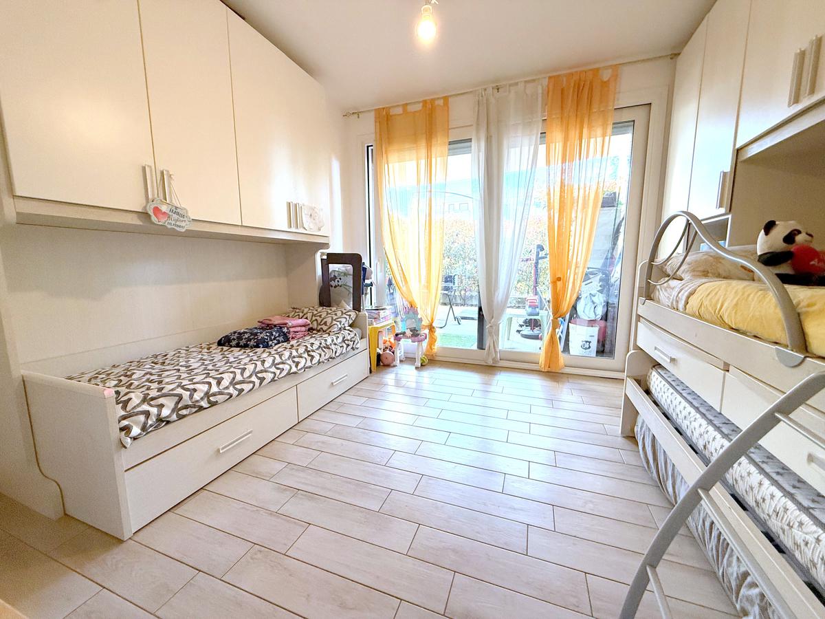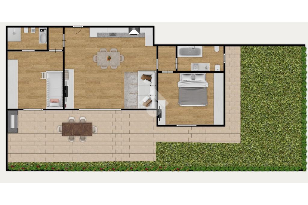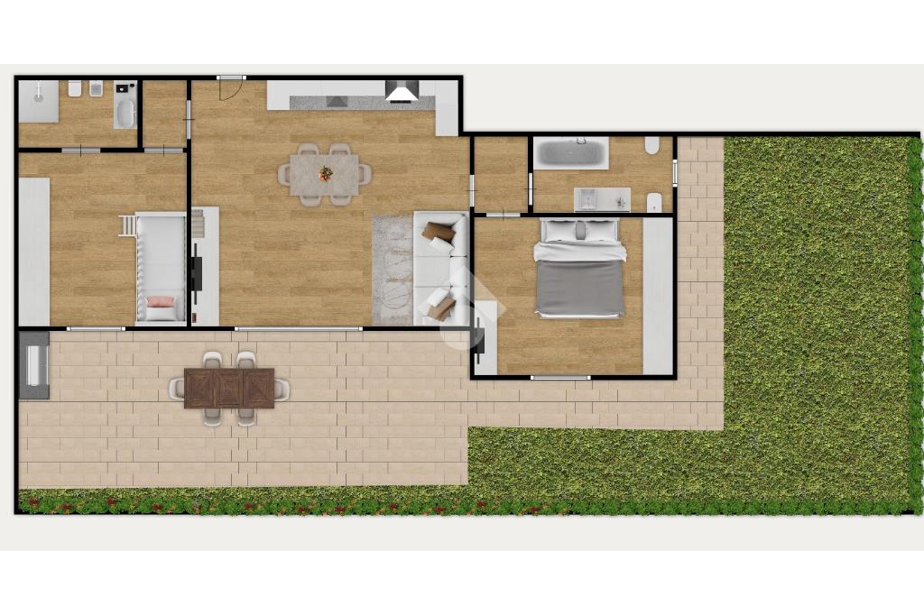 L’abitazione si sviluppa su un unico livello, rendendo ogni ambiente facilmente accessibile e funzionale. L’ingresso accompagna alla zona living, un ambiente accogliente e ben organizzato con soggiorno e cucina a vista, da cui si accede direttamente al giardino e al portico: lo spazio ideale per trascorrere piacevoli momenti all’aperto.