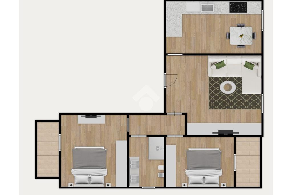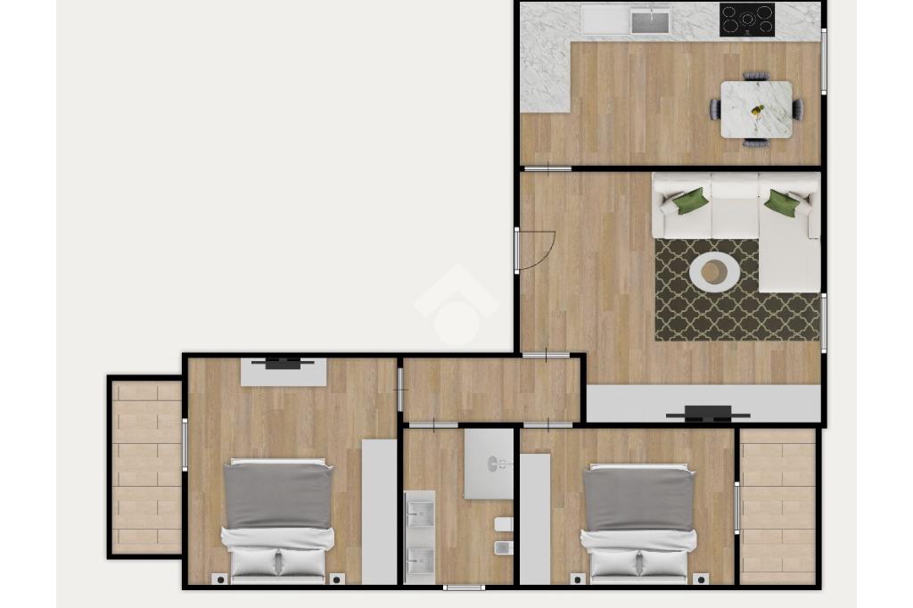 L’ingresso si apre su un ampio soggiorno, moderno e ideale per momenti di convivialità, con accesso diretto al balcone. La cucina è abitabile, perfetta per la vita quotidiana. La zona notte comprende due camere da letto di generose dimensioni e un bagno finestrato, completo di box doccia.