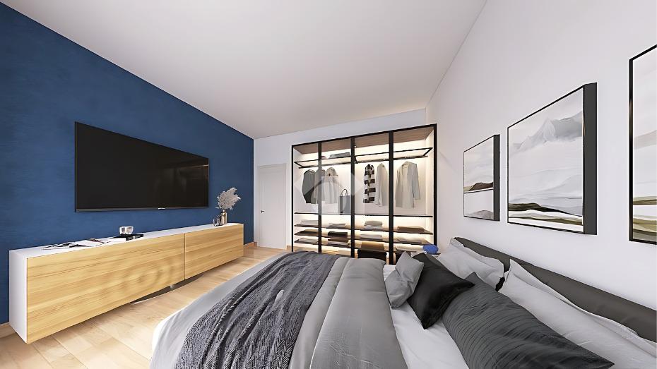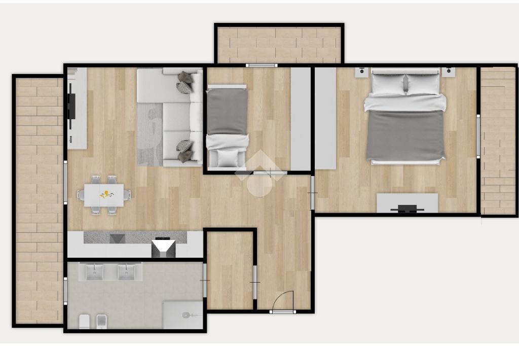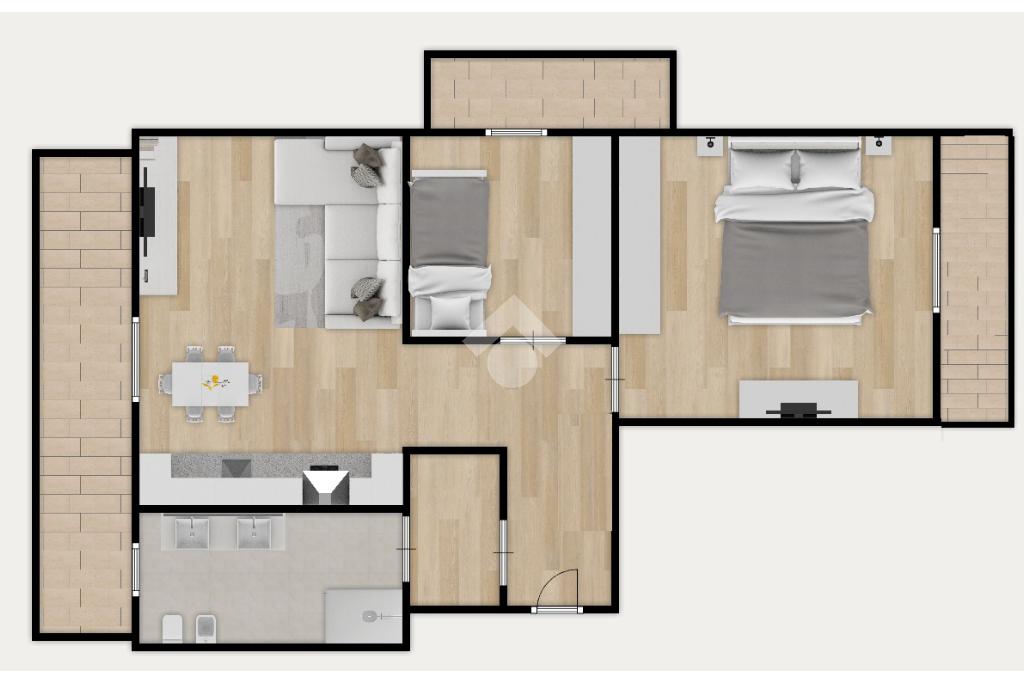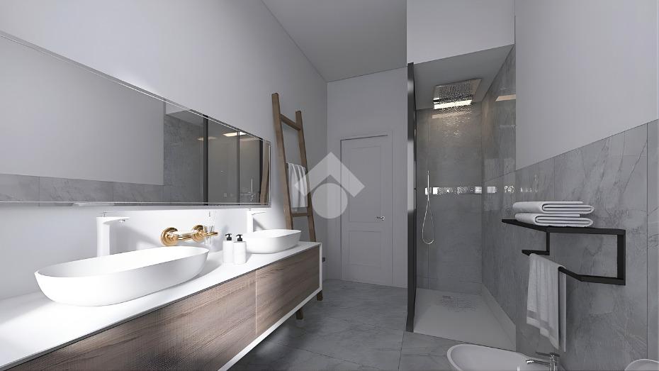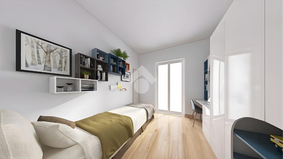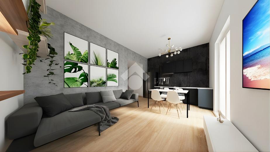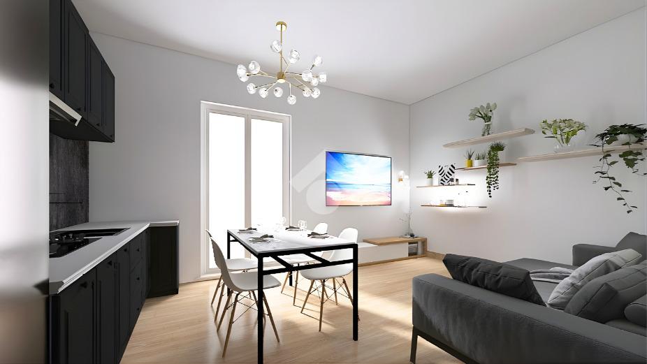 Dall’ingresso si accede a un pratico disimpegno che conduce alla zona living, dove soggiorno e cucina a vista si fondono in un ambiente moderno e conviviale, con accesso diretto al balcone, ideale per momenti di relax all’aperto.