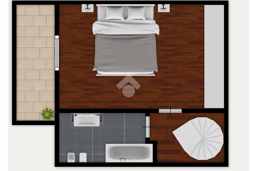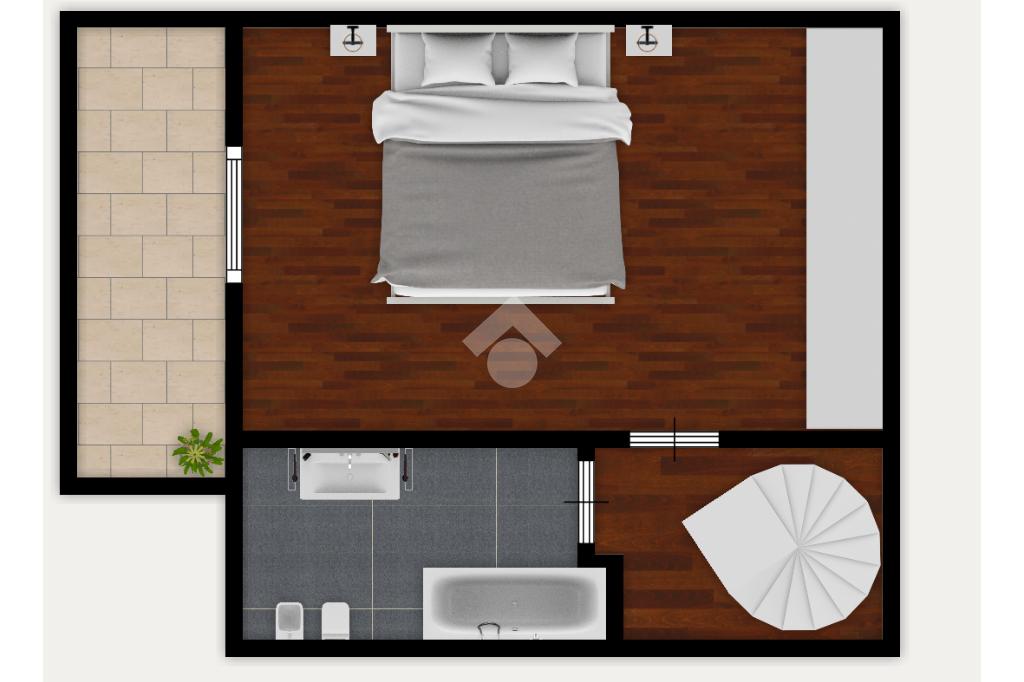 Una scala a chiocciola conduce al piano superiore, dedicato alla zona notte, rendendo l’ambiente caldo e accogliente. Qui troviamo una luminosa camera da letto con accesso diretto al balcone. Completa il piano il bagno finestrato, dotato di vasca e termo arredo.