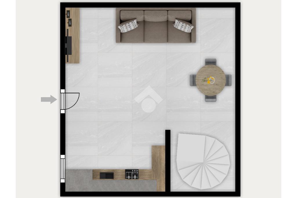 L’ingresso, si apre direttamente sulla zona giorno, un ambiente accogliente e ben organizzato dove il soggiorno si integra perfettamente con la cucina a vista, creando uno spazio funzionale e conviviale, ideale per la vita quotidiana.